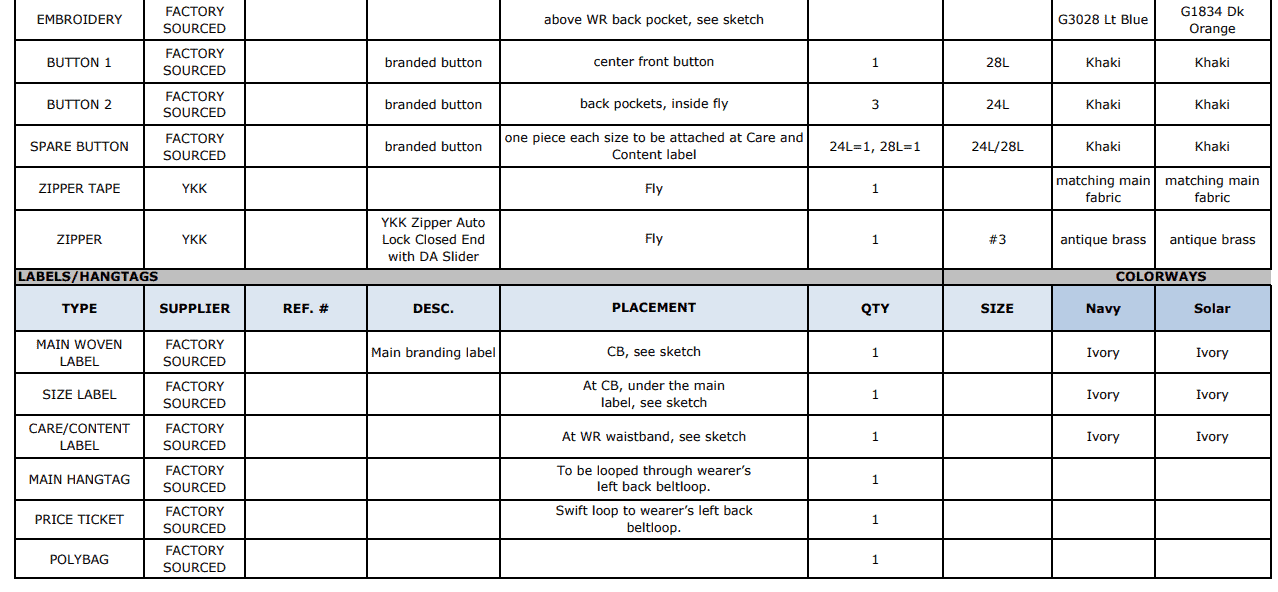 One of the vital components of a tech pack is a Bill of Material, or BOM for short. It lists out all the components that will go into the finished product as well as their unit cost. Specifying the supplier for each material in the BOM helps ensure accurate cost estimation, as different suppliers may offer varying prices, lead times, and quality.