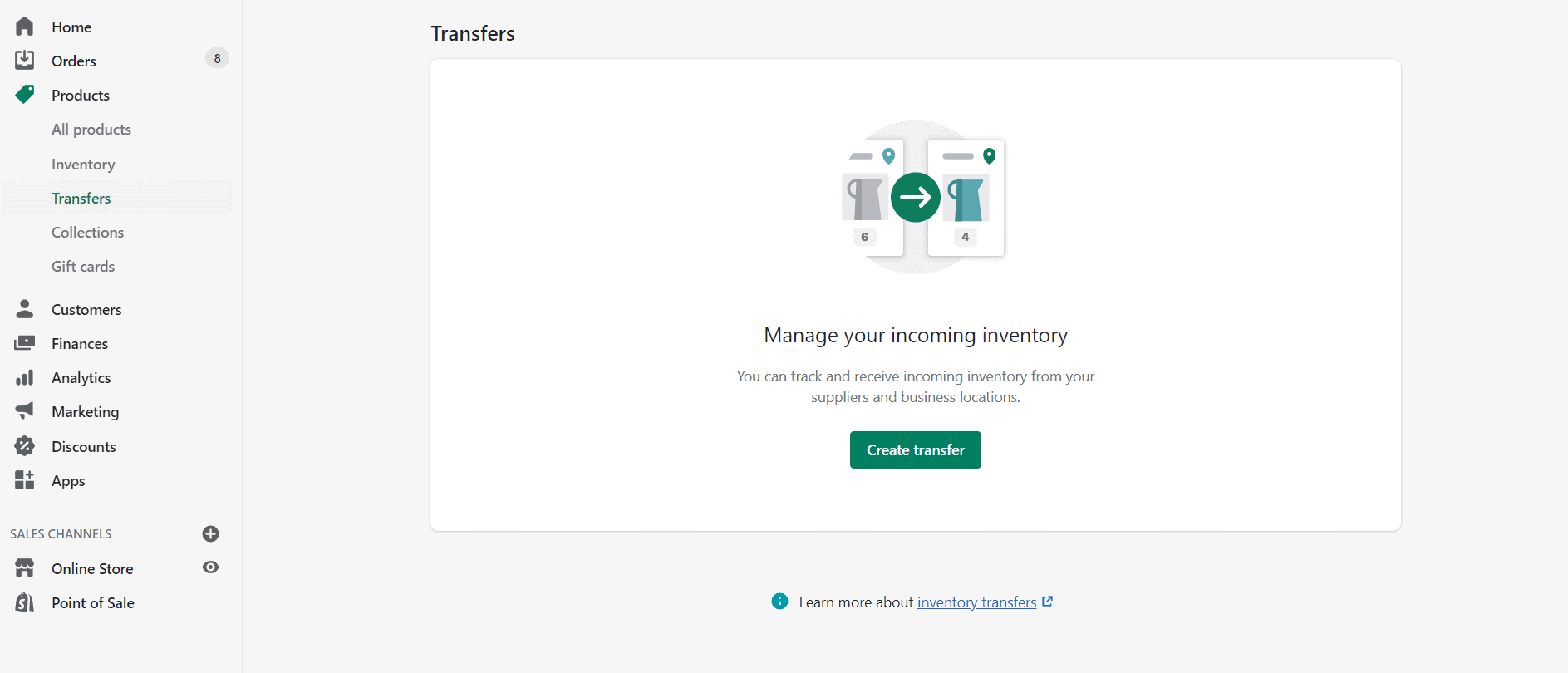 This is perhaps one of the few advanced capabilities of Shopify’s built-in inventory management. It allows users to either manage inventory transfers from suppliers or between locations.